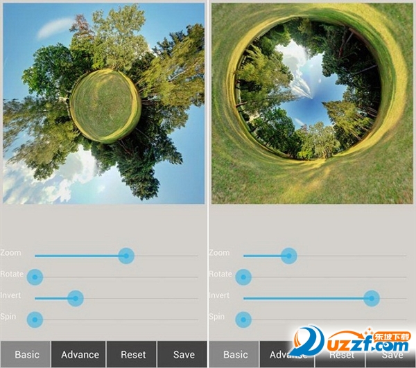 然后就进入了基本设置选项,在这里可以对图片进行缩放(zoom)、旋转(rotate)、倒置(invert)、自转(spin)四种操作,运用得当,基本上一颗小小星球效果的图片就可以做出来了。