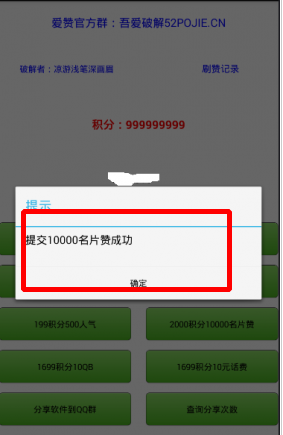 爱赞积分破解版是由吾爱破解论坛大神破解的手机软件,破解后可以使用无限积分,帮助你刷名片赞,留言,冲q币,话费等,需要的朋友赶紧下载吧。