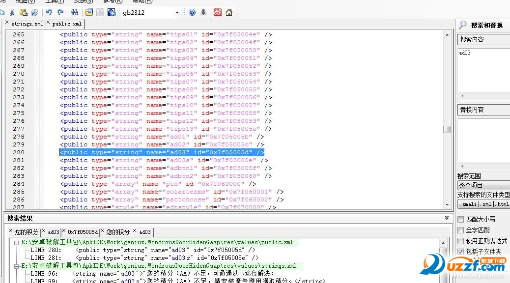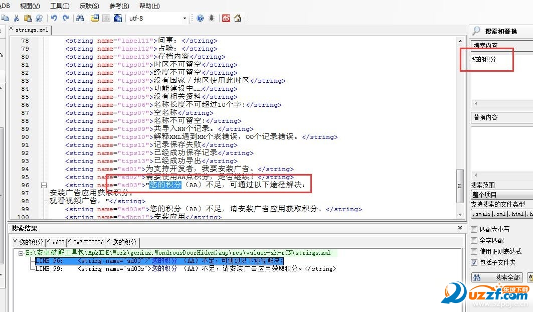 直接讲软件拖进 ApkIDE中 搜索关键字符 : 您的积分0,恩搜到一个关键字符串 ad03 继续搜索