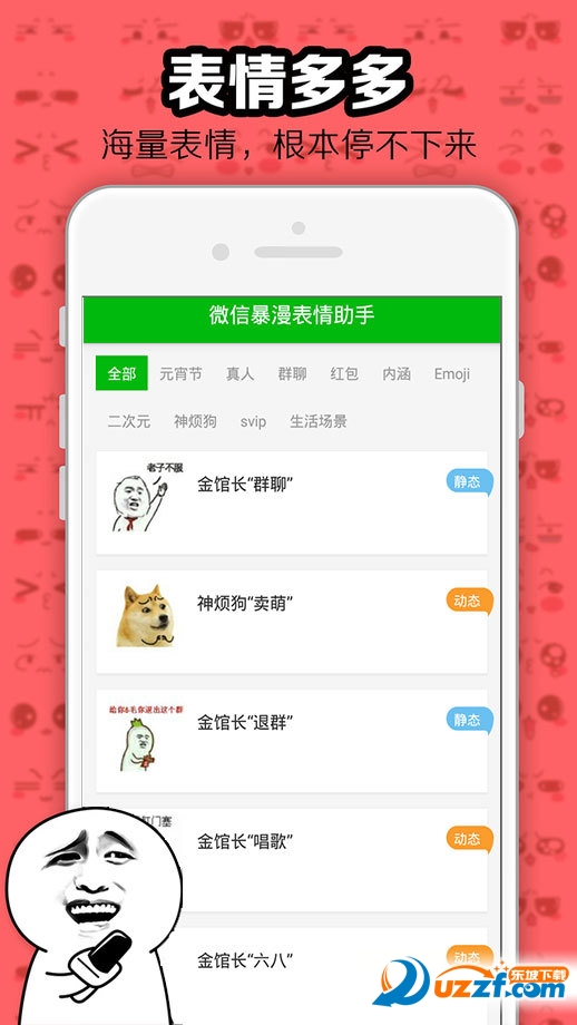 微信和QQ的必备表情神器!暴走漫画表情神器!海量爆笑表情任您选择,各种垂涎已久的微信、line表情、暴漫表情,在表情助手里完全免费!只需一键快捷发送,让您聊天爽翻天!表情助手是您表白心意,恶搞小伙伴,欢乐畅聊的专属APP!