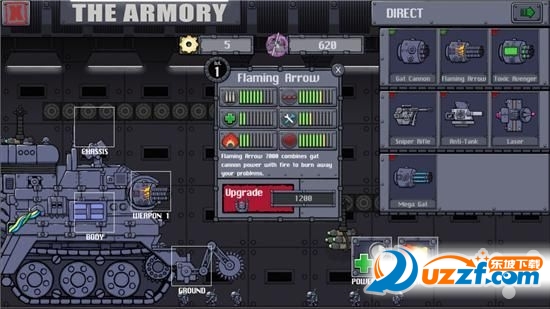 至于下方的武器,只需要在冷却结束之后点击一下即可触发,主要用来对付近身的敌人,话说游戏中的敌人可以是地上走的,空中飞的,甚至还有各种装甲车和地雷,如果不及时升级武器,那么清除这些敌人和障碍就会变得效率低下,很快就会宣告失败。