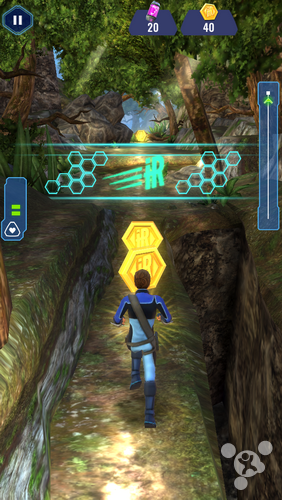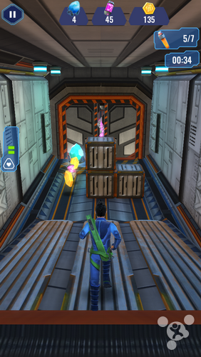 点开图标,类似于指纹识别的游戏开启按钮就显得与众不同,而进入游戏之后,随处可见的科技之美更是让人目不暇接。游戏采用了3D技术对剧集当中的经典人物形象、载具、场景等都进行了还原,但实话说还原的并不是特别出色,只要玩家细心,就能够很明显的发现游戏中随处可见的锯齿和毛边,当然,作为一款跑酷游戏,相比于出色的人物,在激烈的游戏过程当中,我们对于整个场景和道具的关注度显然会更高,而至于这两方面,本作倒是表现的不错,大概是开发团队也跟小编想到一起了吧(笑)。