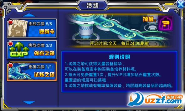 试炼之塔是25级开启,也是装备、钻石、经验和体力的一个获得方式,并且VIP7每天可以重置2次,VIP9每天可以重置3次试炼之塔,是获得最多资源的方式.