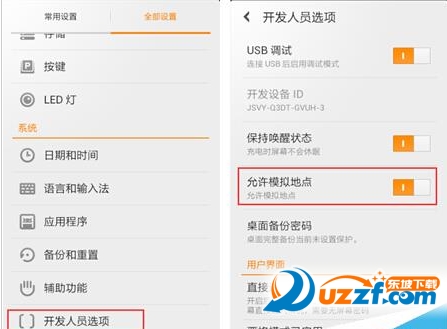 2.2如果手机没有root权限时,请打开手机的系统设置,选择「开发人员选项」,将「允许模拟地点」设置为开启状态;