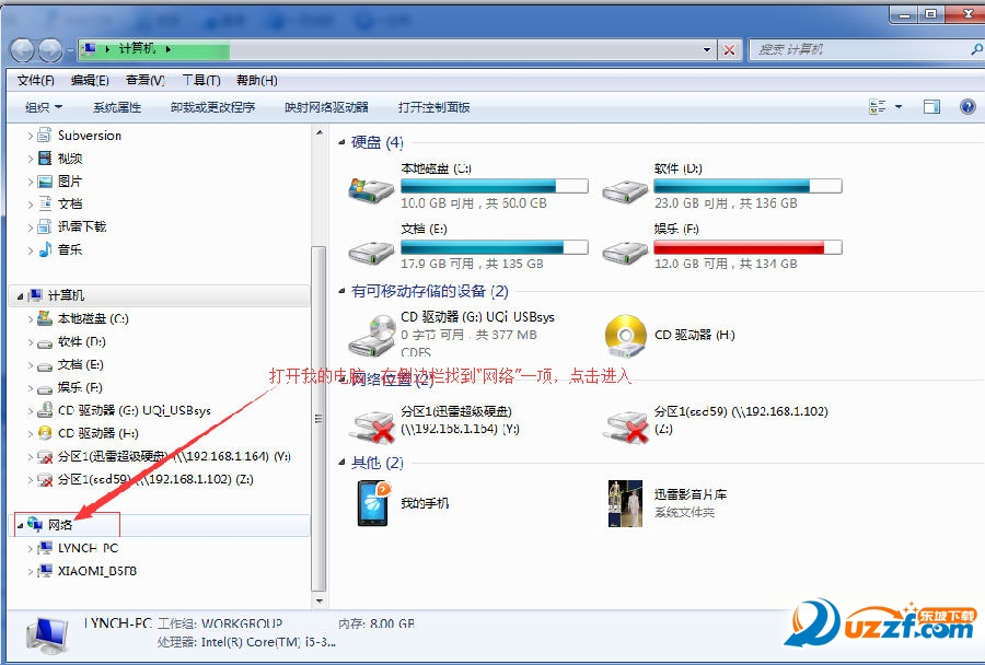 2、访问方式二:打开“我的电脑”—点击左边的“网络”一栏进入网络发现界面,等待几秒后电脑自动搜索到局域网内的下载宝了,如图