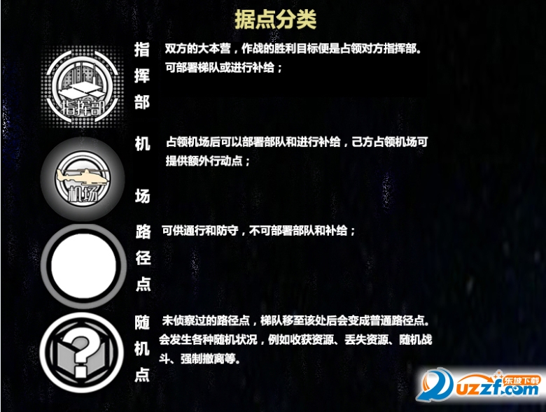 战斗开始前,己方指挥部必须部署梯队,被己方占领的机场可选择部署,部署完毕后点击“开始作战”进入第一回合。我方占领敌方指挥部即可胜利,被敌方占领我方指挥部或击败我方所有梯队则战斗失败。