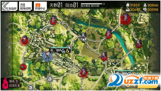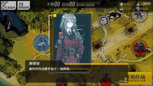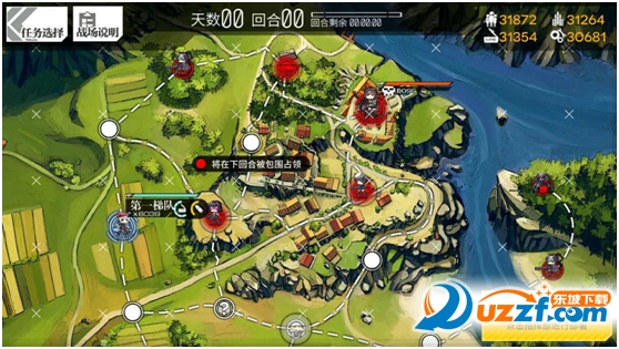 在战斗菜单选择“作战任务”或“模拟作战”关卡后,出现在指挥官面前的是一张战术地图。在战术地图上,用蓝色表示我方占领的据点,红色表示敌方占领的据点,白色表示未被占领的据点。