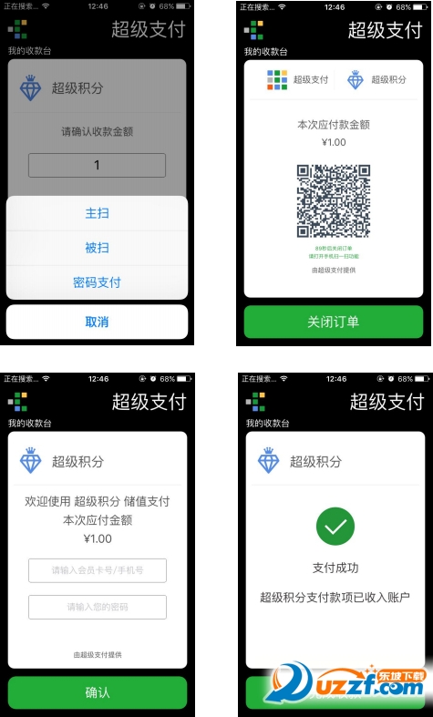 点击超级积分支付,跳转至相应的支付页面,输入金额。当点击确认金额时,会有主扫、被扫、密码支付以及取消的选择按钮,主扫即为客户用手机去扫商家二维码支付,被扫即为商户用扫码枪扫客户手机二维码收款,密码支付只需输入会员卡号和支付密码即可,支付完成后会有提示。