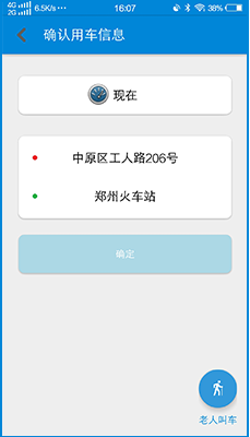 3. 注册好后点击叫车,如下图显示,选择目的地,然后点击“确定”,也可以直接点击右下角的“老人叫车”,通过拨打人工热线进行叫车;