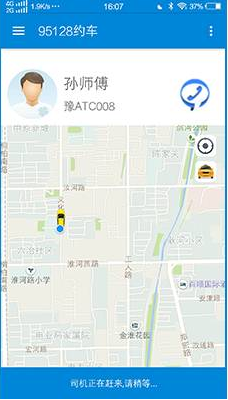 5. 司机接单成功之后,显示如下图:等待司机到达您所在的位置,可以点击电话图标和司机进行联系;