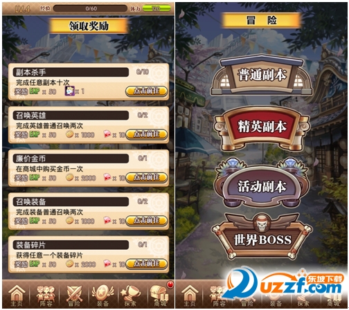 获得经验的最主要的途径无疑就是副本了,普通副本每个关卡需要消耗5点体力,通过则获得30经验点;精英副本每个关卡需要消耗15点体力通过则获得90经验点;算起来都是1点体力获得6个经验点,但是顾名思义,精英副本的难度肯定要大一些,所以在没有绝对把握的情况下,不要轻易尝试精英副本,尤其是已经挑战失败的关卡/(ㄒoㄒ)/~~除此之外,体力的获得也有许多小技巧,例如:成就任务(邀请人)、每天两次的免费体力领取、自动恢复(夜猫子福利)、商城购买(Vip等级越高购买次数越多—这是毅种循环)。