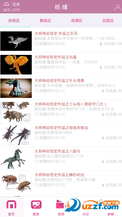 设置了折纸区、剪纸区、纸模型区、创意区,不仅提供图文教程,还提供视频学习。此外,为方便各位纸友交流,本软件添加了群聊、社区功能,还可以添加好友一对一交流。