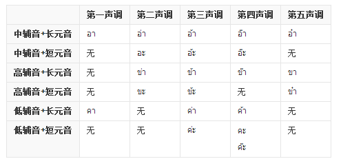 从表格中可以看出,只有中辅音和长元音相拼时,才能发出所有的5个声调。