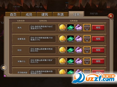 公会经验任务:每日可接取5个任务,分三个等级段(1~40,40~50,50~60)随着个人等级去接相应的任务