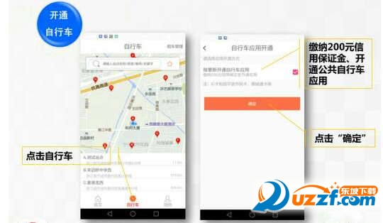 点击自行车,缴纳200元信用保证金、开通公共自行车应用,点击确定