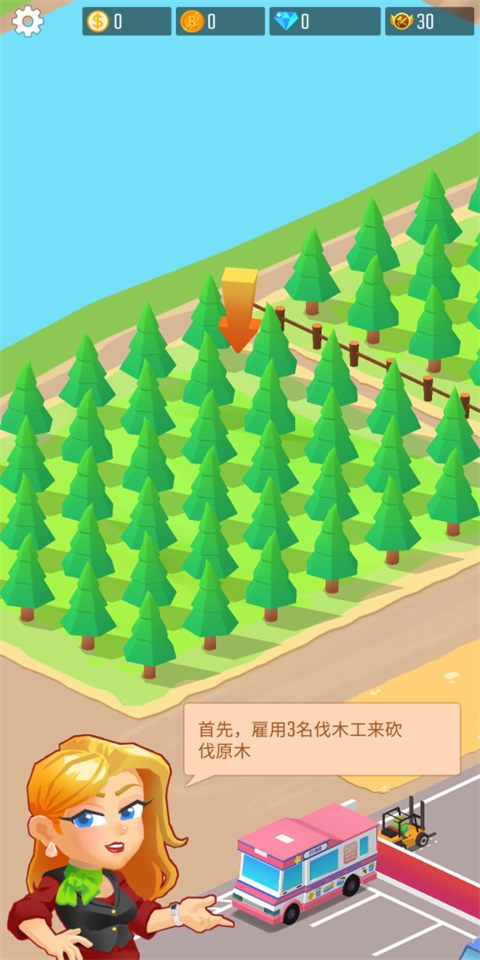 首先在游戏的第一张地图中,玩家需要砍伐树木,然后利用剥树皮的机器将树木去皮获得原木,在用金币制作一个制造木板厂,将原木放进工厂进行加工,获得木板,在将木板放到货车上拉去售卖,获取金币。
