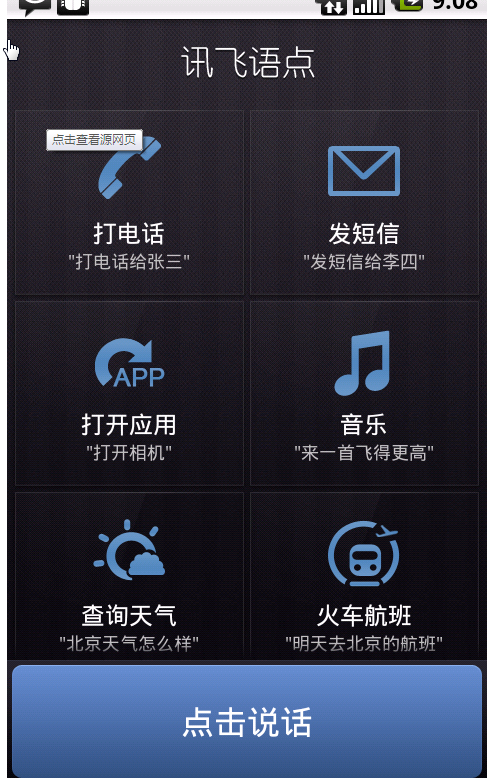 讯飞语点是一款基于讯飞语音云平台的新一代智能语音手机软件,全程语音交互、20项语音功能、智能语音聊天,为您带来最新最潮的语音交互体验。讯飞语点绝非那些早期手机中的语音拨号功能所能相提并论的,它其实已经将语音控制功能落实到了日常的实用功能中,形成了一个语音控制的平台。你只需要对着手机说话就能轻松玩转生活。打电话、发短信、智能聊天,你的手机,你“说”了算!