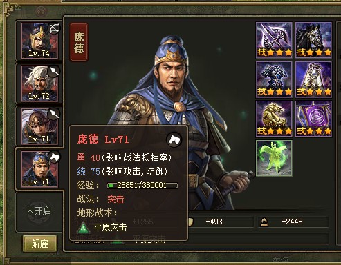 选招将,73级在蛮荒副本招募(如果你73级能打下来的话。),战法突击打三排,特色战术平原突击,统60勇35,打蛮族的时候伤害增加30%,感觉如果不打蛮族,比庞德强一些,也不是特别牛,最大的用处恐怕就在于打蛮族刷人头吧!由于前面已经有比较好的武将组合了,甘宁和吕蒙还是必招的,再招募祝融就要考虑练将的过程,而且她出现得也太晚了。所以祝融可以自己选择性招募(其实笔者不推荐招。),如果招,换掉孙策或者徐晃吧……
