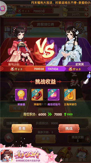 在持续两周的比赛期间,每位小主每日会获得5次免费挑战和3次刷新次数,每天0点系统会重置挑战和刷新次数。系统将会根据小主当前的段位,为小主们匹配段位相近的对手,每击败一个对手就能获得相应积分。因为每天的挑战次数有限,小主们一定要善用刷新功能,谨慎挑战哦!