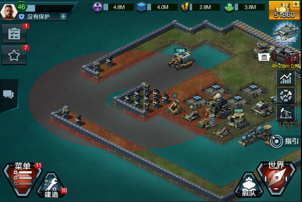 我们可以利用地形编辑,将重要的建筑仓库、大本营等放置在敌舰无法攻击到的位置,并利用地形将基地做成一个塔防形式的城防,预留给敌方单一的路线或路口。