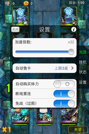 自动售卡上限3星,免战过图和断线重连建议开启,如果你金钱多的话也可以把自动购买体力打开。
