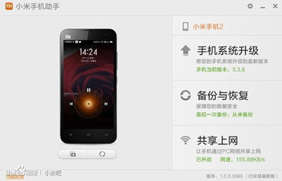手机系统升级:是小米手机 助手最基本也是最重要的功能。点击后,会自动检测系统版本,如果有更新也是自动升级。只要注意保持手机和电脑的连接就可以了。这是小米手机 助手最让人省心的地方。