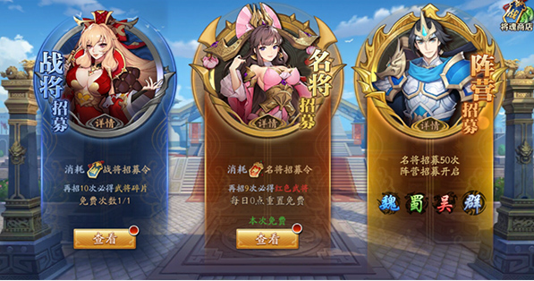 游戏中武将的途径有很多,通过武将招募、商店购买碎片合成、通关副本章节、活动等方式都可以获取武将。其中武将招募是最快速且指向性最强的获得武将的方式,下面来详细介绍一下。