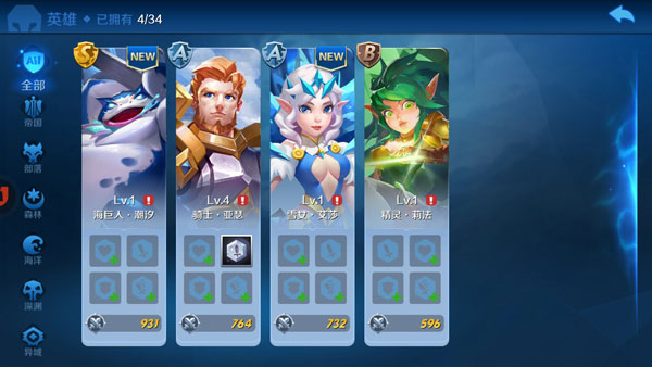 目前总共有34位英雄,分别来自帝国、部落、森林、海洋、深渊、异域6个部落,他们有的擅长物理攻击,有的擅长魔法攻击,每个英雄都有自己的特性和技能,例如B级英雄莉法,来自森林的精灵,擅长使用弓箭射杀敌人,通过晋阶她将拥有多重箭的能力,可以同时攻击三名敌人,使其在关卡守卫中大放异彩。