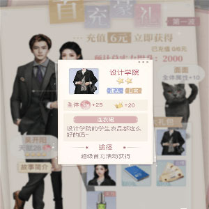 第一波首冲奖励为首冲6元立即获得7重大礼,可获得搭档程序员吴开阳、气场宠物猫面面、连衣裙-设计学院、发型温柔流淌、1万点见识、1万金钱、幸运喷雾50。预计总实力提升2000。