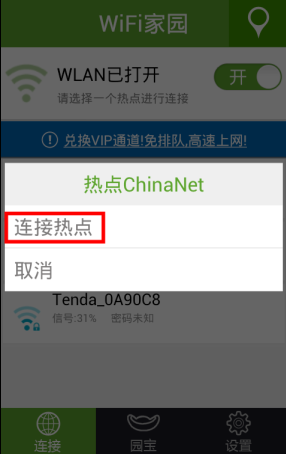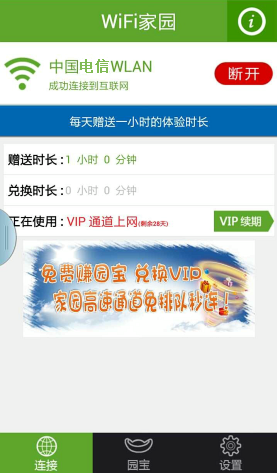 wifi家园呢可以通过积分兑换vip通道,链接成功率就上去了。wifiin在月底之前通常3~5次就可以成功。目前仅支持电信热点,移动,移动edu,电信edu暂不支持。也就是说,如果包月用户在连接移动,移动edu,电信edu时,将正常扣除免费或付费时长哦。
