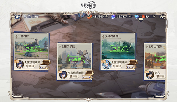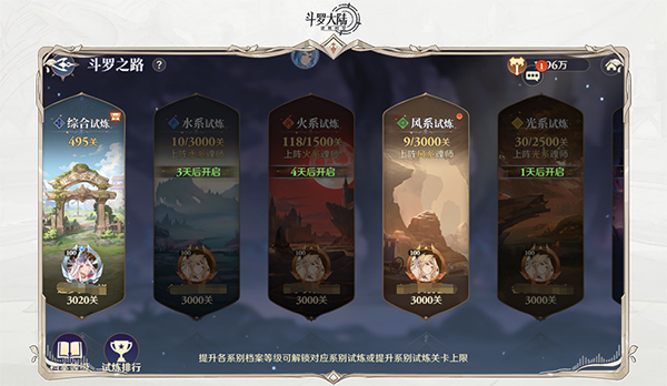 斗罗之路可分为综合试炼、五系试炼,提升各系别的档案等级可用来提升对应试炼关卡的上限。综合试炼主要产出魂师碎片,五系试炼产出召唤券、魂晶,两类试炼都要求我们尽可能提升队伍战力才能持续推进。