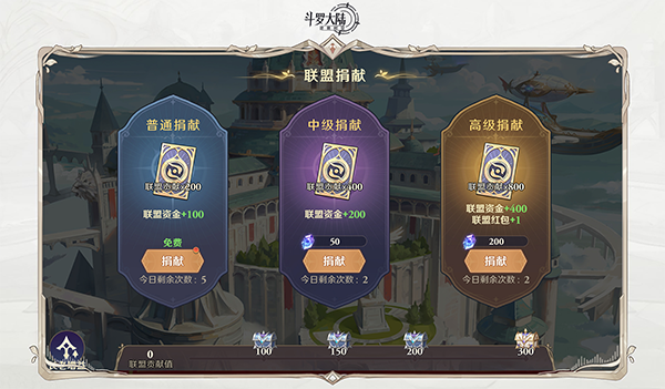在联盟捐献页面,能够进行免费捐献、50/200档位的魂晶捐献,每次捐献可为联盟提供资金,作为成员的我们可以获取对应的联盟贡献。下面的联盟贡献值是计算全盟的贡献次数,一个全体活跃的联盟很容易累积300贡献度,能够得到联盟宴会素材、联盟贡献等奖励。