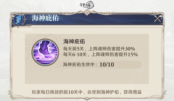 每天挑战的前10关会得到海神庇佑,大幅提升上阵魂师伤害,卡关的朋友们可以每天尝试调整阵容、持续推进。