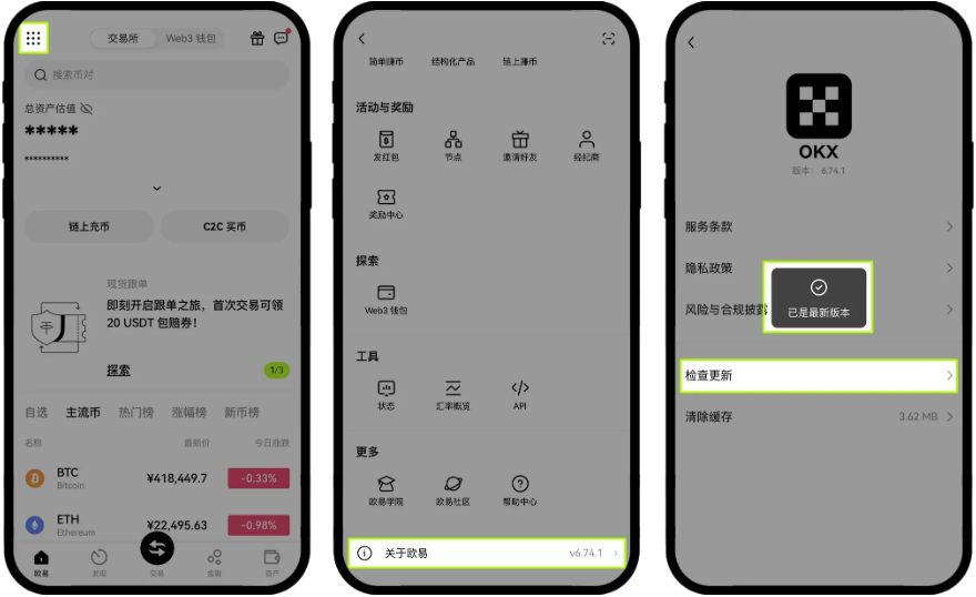 首先点击左上角图标-【个人资料和设置】下拉到最后点击【关于欧易】-【检查更新】