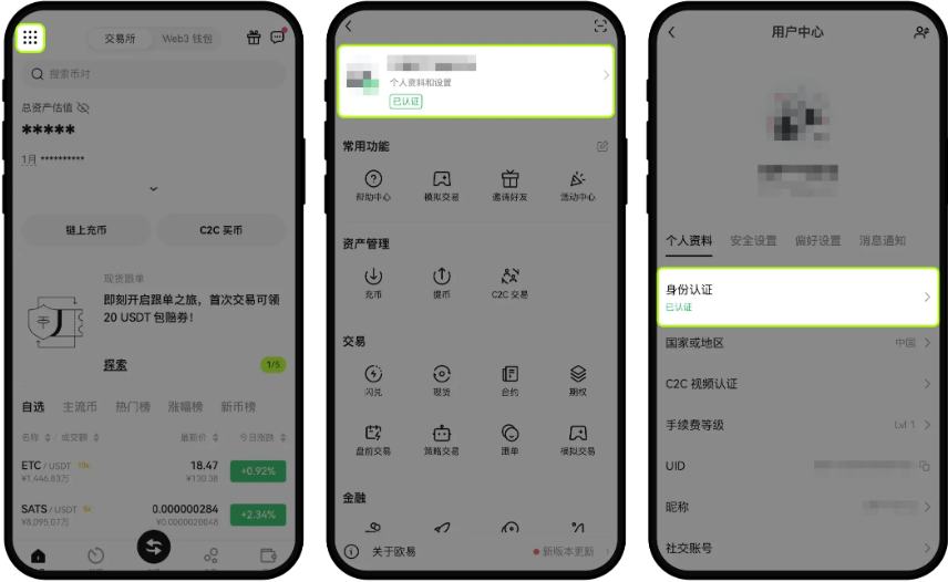 打开欧易 App 首页,点击左上角图标-【个人资料和设置】-【个人资料】-【身份认证】。点击【立即认证】,进入身份认证页面。您需要上传证件照,如身份证的正反面,并通过人脸验证,根据页面提示完成证件上传和身份认证。
