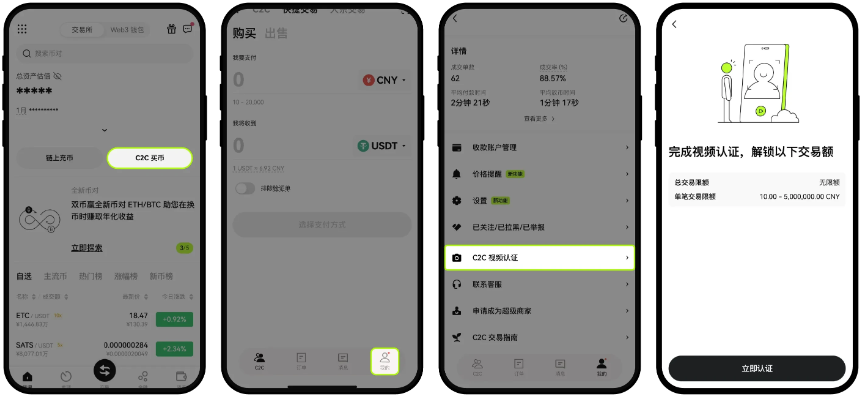 视频认证,需要在【 C2C 买币】中进行,打开欧易 App 首页,点击【 C2C 买币】,选择【我的】-【C2C 视频认证】-【立即认证】。视频认证时,请确保开启声音,打开摄像头,不要连接耳机。系统会朗读风险提示,您不需要跟读。确认信息无误后,请您在“嘀”声后回答【是的】,然后提交资料,等待审核。