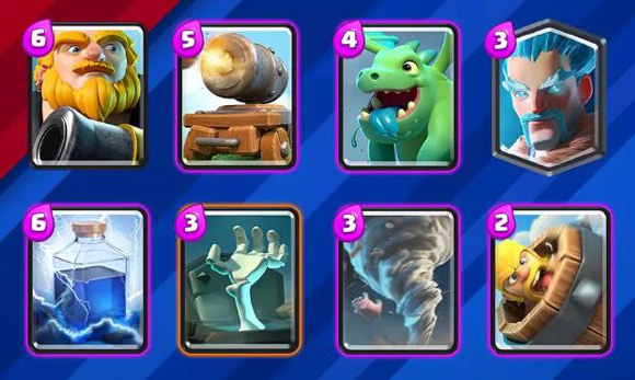 推荐原因:圣水消耗量少,有攻有防,如果对面选择的是高耗率卡牌的话,完全可以打他一个措手不及,并且卡牌容易集齐。缺点是,容易被女武神这种英雄压制,并且生命力低。