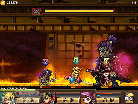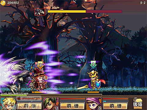 BOSs战第一关:狼人 第一个BOSS并不难,拖动战士把战士放在狼人边上,弓手和法师在后面不停攻击,然后集中精力注意狼人攻击,当狼人冲刺时把战士拖动到空中即可。