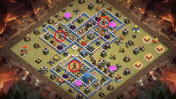 法师塔靠外组成防御链,让蝙蝠的威胁大大降低。大本营用多层城墙包围起来,可以有效分流对方部队,也能起到很好的防御作用。