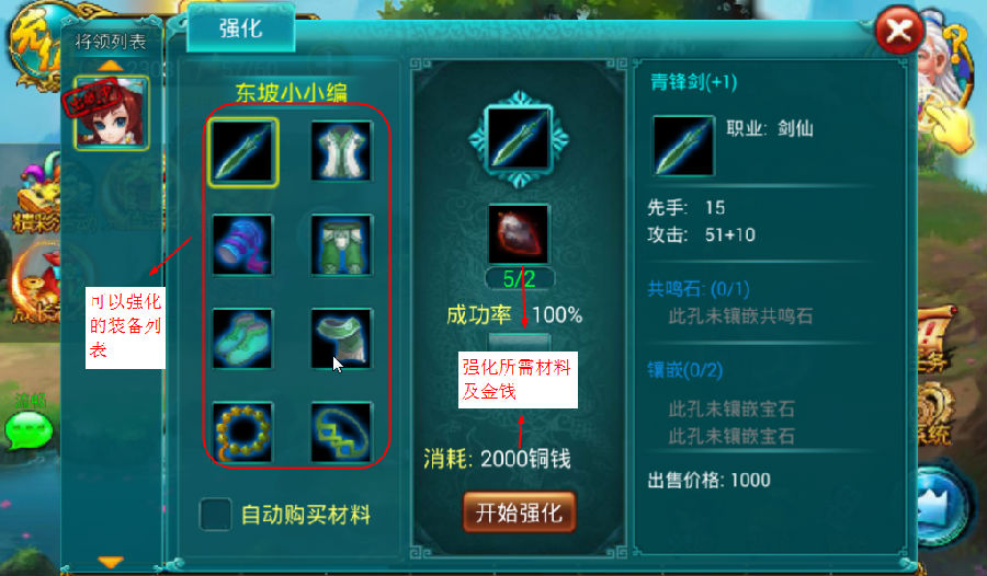 3、强化要消耗强化石以及铜钱,如果材料足够就点击强化吧。
