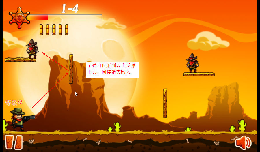 《飞吧子弹》是一款基于物理的射击游戏。在游戏里,你要使用有限的子弹杀死所有的坏人,子弹碰到墙壁或障碍物会折射反弹,从而杀死更多的敌人,你的任务就是用尽量少的子弹将敌人都杀光,用的子弹越少,分数越高!