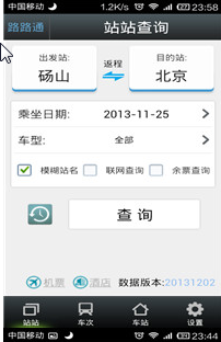 路路通时刻表(Android版)是一款针对安卓平台开发的火车时刻表,具有数据最准确、软件最小、功能最全、完全免费、更新最及时、操作最简单等特色!是查询火车时刻的必备软件!