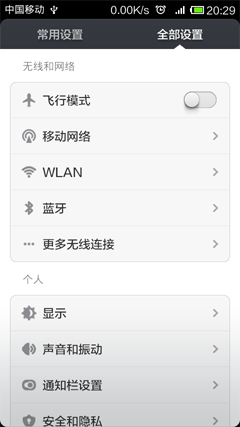 “全部设置”和“常用设置”中都有“WLAN”的选项。按钮形状是全球通用的WiFi小扇子