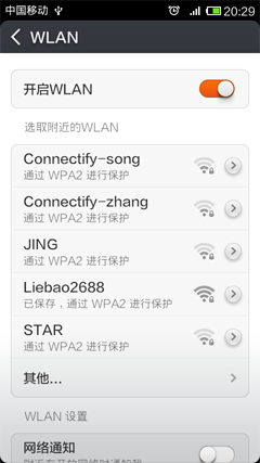 打开“WLAN”,手机开始自动搜索附近的WiFi热点了。不过,整天开着WLAN很耗手机电量,建议不需要连WiFi的时候可以关闭它。