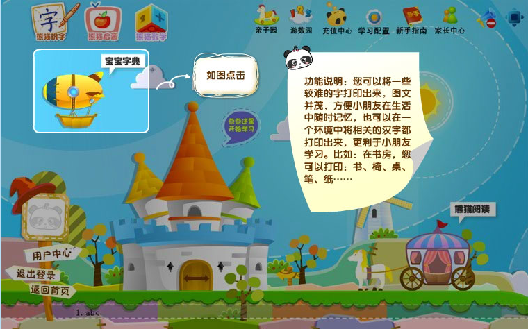 熊猫识字是熊猫乐园专门为3-10岁小朋友开发的儿童识字软件,包括2000多个常用汉字、9000多个配套词组、200多个素质教育故事、寓言故事画报,科学小常识等内容,软件从宝宝兴趣入手,寓教于乐,在看动画故事、玩识字游戏过程中快乐高效的完成学习,同时潜移默化的让宝宝养成良好的性格、习惯,形成终身受益的品德、情感和能力。