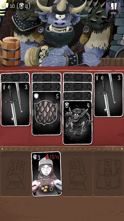 游戏延续了前作的核心设定:你坐在酒馆里,对面是形形色色的怪物,每张牌都代表一次交锋。剑卡用来砍人,盾牌卡用来扛伤,药水卡回血,金币卡攒分——规则不复杂,但当你面对16张牌同时铺在桌面上时,每一步怎么走就变得非常考验脑子了。游戏还加入了装备系统和Roguelike随机机制,每次进地牢遇到的怪物和卡牌都不一样,就算通关了也忍不住想再开一把。