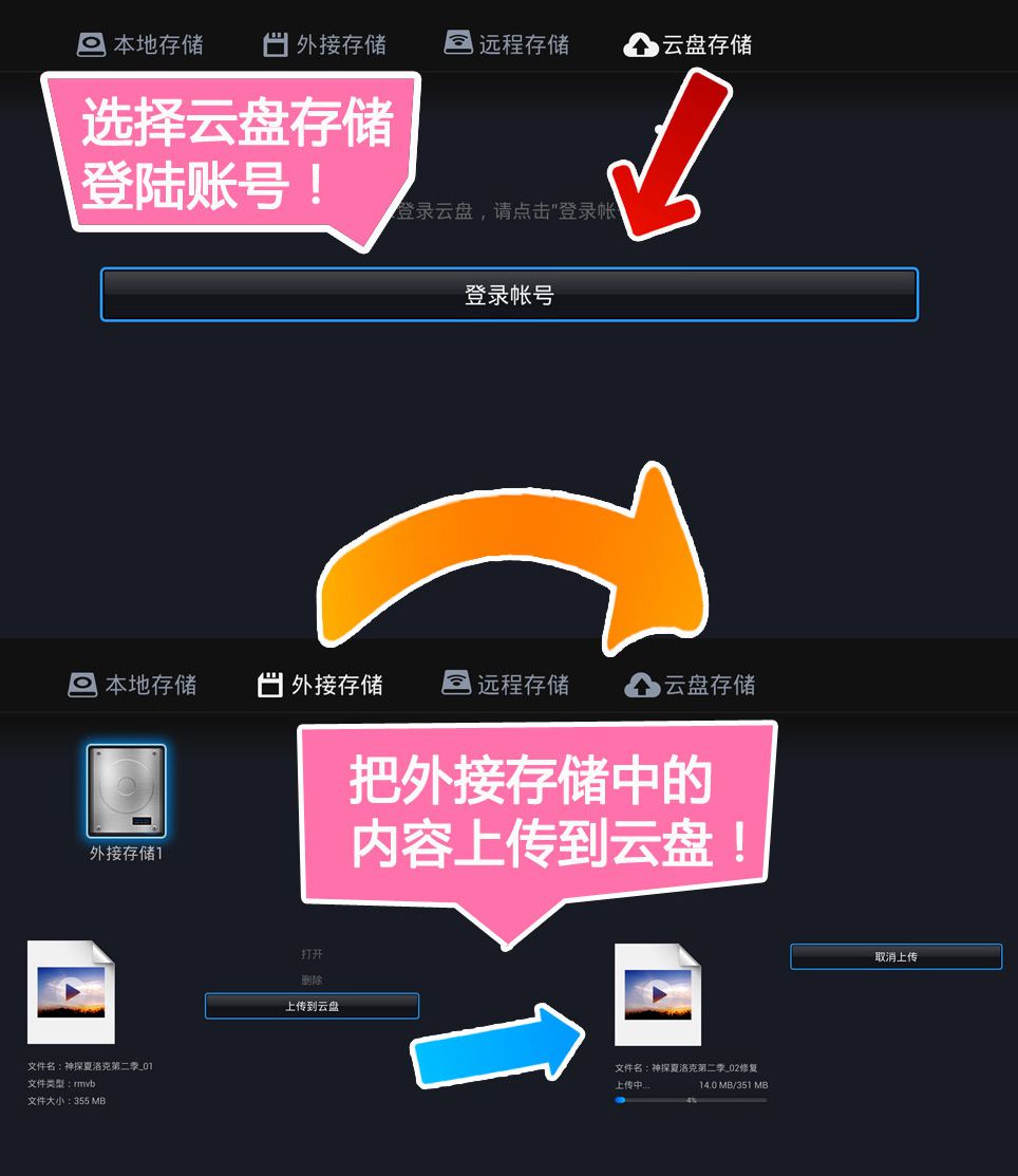 步骤二,登陆云盘账号,把外接存储中的内容上传到云盘;