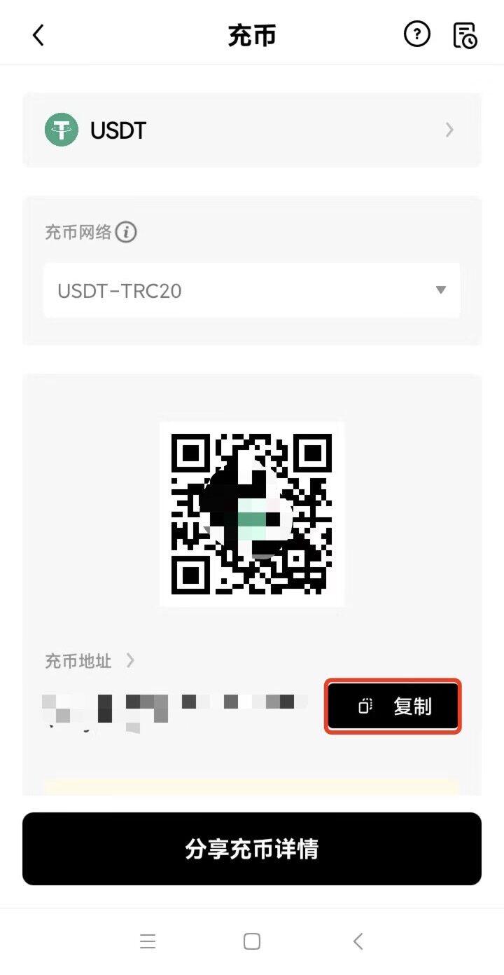 您可以通过保存页面二维码,复制充币地址,分享充币详情的方式进行获取。