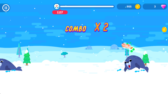 2、随后企鹅就会飞出,落下过程中点击屏幕,可以让企鹅快速落下,落到其他动物肚子上就能进行弹射。