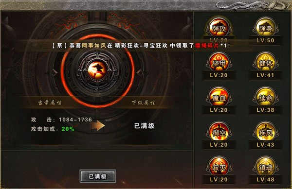 玩家可以通过击杀BOSS,活动,商城购买获得血符,玄甲,魂珠,龙戒结晶。对神炉进行升阶,可以增加玩家的生命,攻击,防御。暴击。使你在怪物攻城跨服战场等活动中有更好的游戏体验,享受砍瓜切菜的乐趣。